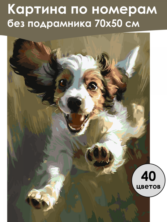 Картина по номерам без подрамника, размер 70х50 см, произведена нами. Она включает 40 оттенков и 1811 контуров, что придаёт ей глубину цвета и плавные переходы. Картина выглядит более ярко и живо. В комплект входит глянцевый лак, которым можно покрыть работу по желанию. Краски имеют хорошую укрывистость, хватает двух проходов что бы закрасить символы на схеме. Так же они сохраняют текстуру мазков, не растекаясь и не разглаживаясь полностью на холсте. При покрытии глянцевым лаком создаётся эффект приближенный к масляной живописи. Краски упакованы герметично, что сохраняет их жидкими. Все необходимые инструменты для начала работы также входят в комплект. Мы не используем экосольвентные чернила, которые содержат свинец и могут быть вредны для здоровья. Наши картины напечатаны безопасными водными пигментными чернилами, обеспечивающими чёткое изображение и легко читаемые обозначения. Холст плотный, имеет мелкую зернистость, легко разглаживается и устойчив к сминанию. Картина поставляется в бурой коробке. Следует отметить, что картина без подрамника её нельзя натянуть на подрамник из-за узких краёв, она предназначена для оформления в рамочку. Веселый маленький бело-коричневый пес с длинными ушами, который бежит в направлении зрителя, широко открыв пасть и выразительно раскрыв глаза; его лапы вытянуты вперёд, создавая ощущение движения и радости, фон размыт, акцентируя внимание на животном.