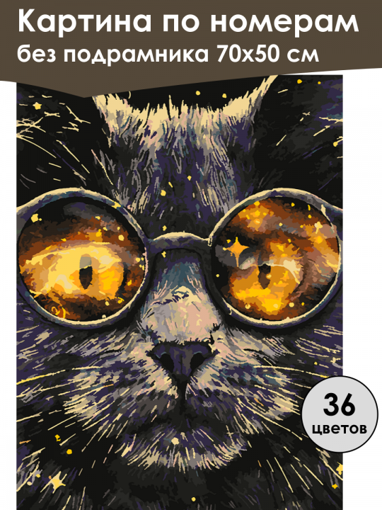 Картина по номерам без подрамника, размер 70х50 см, произведена нами. Она включает 36 оттенков и 2742 контуров, что придаёт ей глубину цвета и плавные переходы. Картина выглядит более ярко и живо. В комплект входит глянцевый лак, которым можно покрыть работу по желанию. Краски имеют хорошую укрывистость, хватает двух проходов что бы закрасить символы на схеме. Так же они сохраняют текстуру мазков, не растекаясь и не разглаживаясь полностью на холсте. При покрытии глянцевым лаком создаётся эффект приближенный к масляной живописи. Краски упакованы герметично, что сохраняет их жидкими. Все необходимые инструменты для начала работы также входят в комплект. Мы не используем экосольвентные чернила, которые содержат свинец и могут быть вредны для здоровья. Наши картины напечатаны безопасными водными пигментными чернилами, обеспечивающими чёткое изображение и легко читаемые обозначения. Холст плотный, имеет мелкую зернистость, легко разглаживается и устойчив к сминанию. Картина поставляется в бурой коробке. Следует отметить, что картина без подрамника её нельзя натянуть на подрамник из-за узких краёв, она предназначена для оформления в рамочку. Стилизованное изображение морды кота в крупных круглых очках в ретро-стиле, линзы очков переливаются яркими оранжевыми и желтоватыми оттенками, создающими эффект звездного неба, мех кота изображён в оттенках серого с резкими контрастными штрихами, что добавляет рисунку выразительности и художественной глубины.