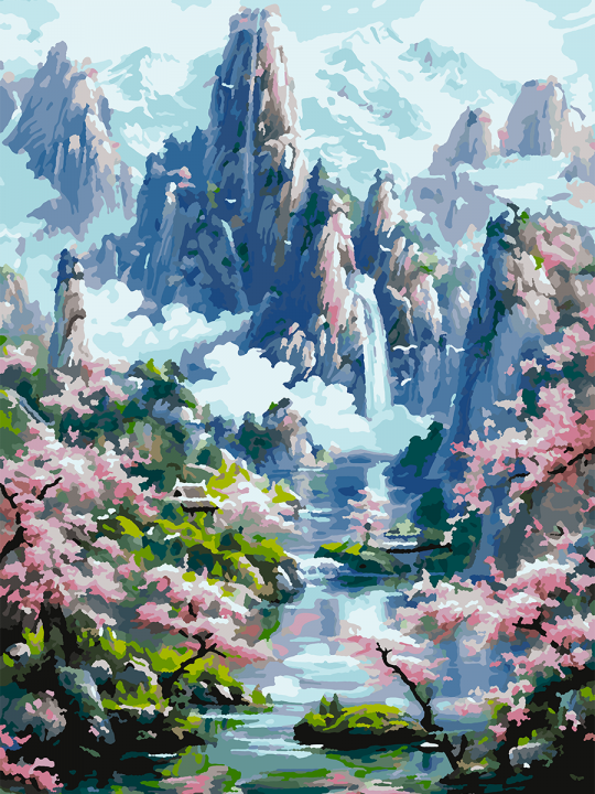Картина по номерам на подрамнике, размер 70х50 см, произведена нами. Она включает 39 оттенков и 3263 контуров, что придаёт ей глубину цвета и плавные переходы. Картина выглядит более ярко и живо. В комплект входит глянцевый лак, которым можно покрыть работу по желанию. Краски имеют хорошую укрывистость, хватает двух проходов что бы закрасить символы на схеме. Так же они сохраняют текстуру мазков, не растекаясь и не разглаживаясь полностью на холсте. При покрытии глянцевым лаком создаётся эффект приближенный к масляной живописи. Краски упакованы герметично, что сохраняет их жидкими. Все необходимые инструменты для начала работы также включены в комплект, в том числе и крепления на стену. В картине используется крепкий подрамник со специальной вставкой, которая предотвращает провисание холста во время рисования. Это обеспечивает комфортный процесс работы и гарантирует, что холст всегда будет оставаться хорошо натянутым. Мы не используем экосольвентные чернила, которые содержат свинец и могут быть вредны для здоровья. Наши картины напечатаны безопасными водными пигментными чернилами, обеспечивающими чёткое изображение и легко читаемые обозначения. Холст плотный, имеет мелкую зернистость, легко разглаживается и устойчив к сминанию. Картина поставляется в защищённой бурой коробке. Живописный пейзаж с высокими величественными горами, окружёнными розовыми и белыми облаками, на переднем плане течёт река, обрамлённая пышными цветущими деревьями, создающими атмосферу спокойствия и гармонии.
