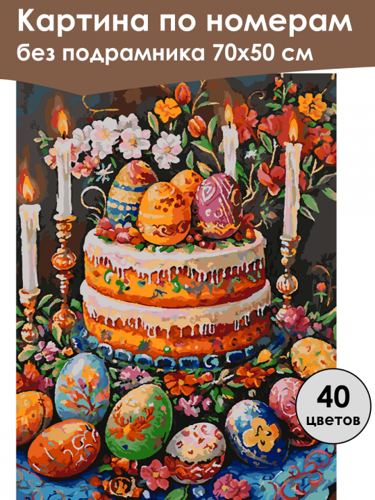 Картина по номерам без подрамника, размер 70х50 см, произведена нами. Она включает 40 оттенков и 3690 контуров, что придаёт ей глубину цвета и плавные переходы. Картина выглядит более ярко и живо. В комплект входит глянцевый лак, которым можно покрыть работу по желанию. Краски имеют хорошую укрывистость, хватает двух проходов что бы закрасить символы на схеме. Так же они сохраняют текстуру мазков, не растекаясь и не разглаживаясь полностью на холсте. При покрытии глянцевым лаком создаётся эффект приближенный к масляной живописи. Краски упакованы герметично, что сохраняет их жидкими. Все необходимые инструменты для начала работы также входят в комплект. Мы не используем экосольвентные чернила, которые содержат свинец и могут быть вредны для здоровья. Наши картины напечатаны безопасными водными пигментными чернилами, обеспечивающими чёткое изображение и легко читаемые обозначения. Холст плотный, имеет мелкую зернистость, легко разглаживается и устойчив к сминанию. Картина поставляется в бурой коробке. Следует отметить, что картина без подрамника её нельзя натянуть на подрамник из-за узких краёв, она предназначена для оформления в рамочку. Яркая праздничная композиция с двухъярусным куличом, украшенным глазурью, на верхнем ярусе которого расположены расписные пасхальные яйца; на переднем плане множество таких же яиц в разнообразном орнаменте, вокруг цветы и зажжённые свечи, создающие атмосферу радости и уюта.