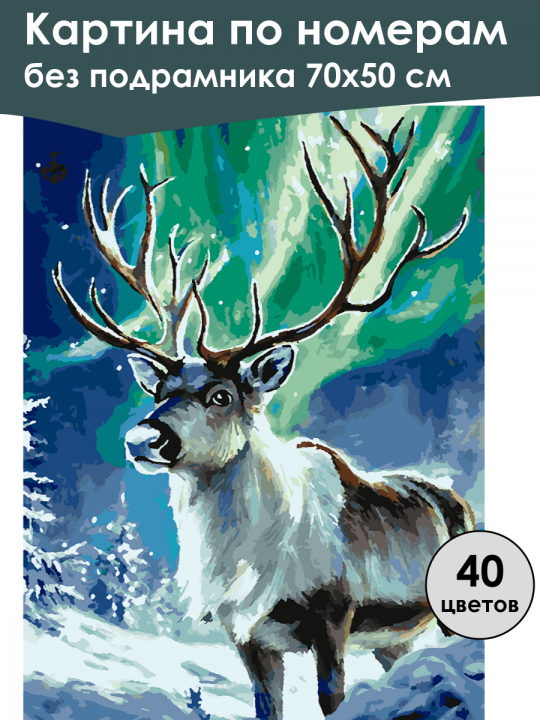 Картина по номерам без подрамника, размер 70х50 см, произведена нами. Она включает 40 оттенков и 2149 контуров, что придаёт ей глубину цвета и плавные переходы. Картина выглядит более ярко и живо. В комплект входит глянцевый лак, которым можно покрыть работу по желанию. Краски имеют хорошую укрывистость, хватает двух проходов что бы закрасить символы на схеме. Так же они сохраняют текстуру мазков, не растекаясь и не разглаживаясь полностью на холсте. При покрытии глянцевым лаком создаётся эффект приближенный к масляной живописи. Краски упакованы герметично, что сохраняет их жидкими. Все необходимые инструменты для начала работы также входят в комплект. Мы не используем экосольвентные чернила, которые содержат свинец и могут быть вредны для здоровья. Наши картины напечатаны безопасными водными пигментными чернилами, обеспечивающими чёткое изображение и легко читаемые обозначения. Холст плотный, имеет мелкую зернистость, легко разглаживается и устойчив к сминанию. Картина поставляется в бурой коробке. Следует отметить, что картина без подрамника её нельзя натянуть на подрамник из-за узких краёв, она предназначена для оформления в рамочку. Северный олень с величественными рогами на фоне зимнего пейзажа, окружённого заснеженными деревьями, с яркими зелёно-голубыми оттенками северного сияния на небе.