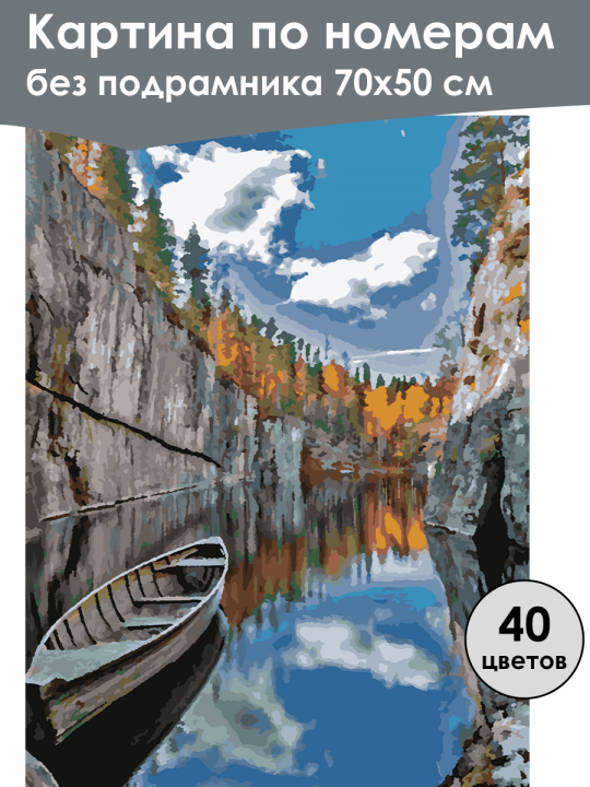Картина по номерам без подрамника, размер 70х50 см, произведена нами. Она включает 40 оттенков и 3280 контуров, что придаёт ей глубину цвета и плавные переходы. Картина выглядит более ярко и живо. В комплект входит глянцевый лак, которым можно покрыть работу по желанию. Краски имеют хорошую укрывистость, хватает двух проходов что бы закрасить символы на схеме. Так же они сохраняют текстуру мазков, не растекаясь и не разглаживаясь полностью на холсте. При покрытии глянцевым лаком создаётся эффект приближенный к масляной живописи. Краски упакованы герметично, что сохраняет их жидкими. Все необходимые инструменты для начала работы также входят в комплект. Мы не используем экосольвентные чернила, которые содержат свинец и могут быть вредны для здоровья. Наши картины напечатаны безопасными водными пигментными чернилами, обеспечивающими чёткое изображение и легко читаемые обозначения. Холст плотный, имеет мелкую зернистость, легко разглаживается и устойчив к сминанию. Картина поставляется в бурой коробке. Следует отметить, что картина без подрамника её нельзя натянуть на подрамник из-за узких краёв, она предназначена для оформления в рамочку. Лодка покоится на спокойной глади узкого озера, окруженного высокими каменными утёсами и осенними деревьями, которые отражаются в воде под ярким голубым небом с плывущими облаками.