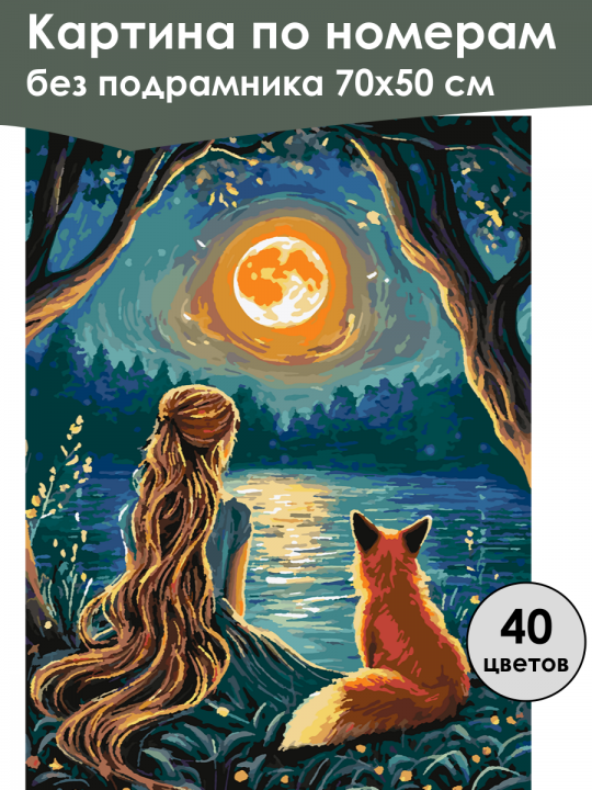 Картина по номерам без подрамника, размер 70х50 см, произведена нами. Она включает 40 оттенков и 2904 контуров, что придаёт ей глубину цвета и плавные переходы. Картина выглядит более ярко и живо. В комплект входит глянцевый лак, которым можно покрыть работу по желанию. Краски имеют хорошую укрывистость, хватает двух проходов что бы закрасить символы на схеме. Так же они сохраняют текстуру мазков, не растекаясь и не разглаживаясь полностью на холсте. При покрытии глянцевым лаком создаётся эффект приближенный к масляной живописи. Краски упакованы герметично, что сохраняет их жидкими. Все необходимые инструменты для начала работы также входят в комплект. Мы не используем экосольвентные чернила, которые содержат свинец и могут быть вредны для здоровья. Наши картины напечатаны безопасными водными пигментными чернилами, обеспечивающими чёткое изображение и легко читаемые обозначения. Холст плотный, имеет мелкую зернистость, легко разглаживается и устойчив к сминанию. Картина поставляется в бурой коробке. Следует отметить, что картина без подрамника её нельзя натянуть на подрамник из-за узких краёв, она предназначена для оформления в рамочку. Девушка с длинными волнистыми волосами и лисица сидят спиной к зрителю на берегу водоёма, любуясь полнолунием и отражением луны на воде, окружённые густой лесной растительностью; луна светится яркими оранжевыми и жёлтыми оттенками, создавая сказочную атмосферу ночи.