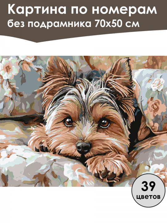 Картина по номерам без подрамника, размер 70х50 см, произведена нами. Она включает 39 оттенков и 3363 контуров, что придаёт ей глубину цвета и плавные переходы. Картина выглядит более ярко и живо. В комплект входит глянцевый лак, которым можно покрыть работу по желанию. Краски имеют хорошую укрывистость, хватает двух проходов что бы закрасить символы на схеме. Так же они сохраняют текстуру мазков, не растекаясь и не разглаживаясь полностью на холсте. При покрытии глянцевым лаком создаётся эффект приближенный к масляной живописи. Краски упакованы герметично, что сохраняет их жидкими. Все необходимые инструменты для начала работы также входят в комплект. Мы не используем экосольвентные чернила, которые содержат свинец и могут быть вредны для здоровья. Наши картины напечатаны безопасными водными пигментными чернилами, обеспечивающими чёткое изображение и легко читаемые обозначения. Холст плотный, имеет мелкую зернистость, легко разглаживается и устойчив к сминанию. Картина поставляется в бурой коробке. Следует отметить, что картина без подрамника её нельзя натянуть на подрамник из-за узких краёв, она предназначена для оформления в рамочку. Собака породы йоркширский терьер, с выразительными глазами и пушистой шерстью лежит на постельных принадлежностях с цветочным узором, передняя часть туловища и голова видны крупным планом; фон выдержан в мягких пастельных тонах, создавая уютную и расслабляющую атмосферу.