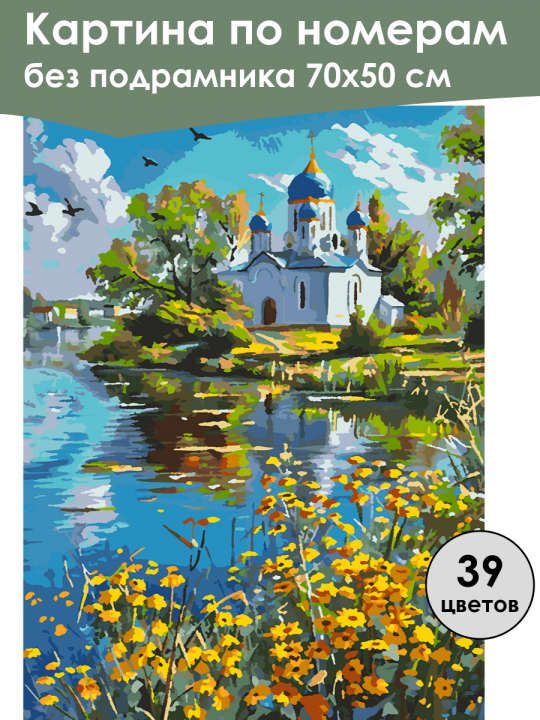 Картина по номерам без подрамника, размер 70х50 см, произведена нами. Она включает 39 оттенков и 3282 контуров, что придаёт ей глубину цвета и плавные переходы. Картина выглядит более ярко и живо. В комплект входит глянцевый лак, которым можно покрыть работу по желанию. Краски имеют хорошую укрывистость, хватает двух проходов что бы закрасить символы на схеме. Так же они сохраняют текстуру мазков, не растекаясь и не разглаживаясь полностью на холсте. При покрытии глянцевым лаком создаётся эффект приближенный к масляной живописи. Краски упакованы герметично, что сохраняет их жидкими. Все необходимые инструменты для начала работы также входят в комплект. Мы не используем экосольвентные чернила, которые содержат свинец и могут быть вредны для здоровья. Наши картины напечатаны безопасными водными пигментными чернилами, обеспечивающими чёткое изображение и легко читаемые обозначения. Холст плотный, имеет мелкую зернистость, легко разглаживается и устойчив к сминанию. Картина поставляется в бурой коробке. Следует отметить, что картина без подрамника её нельзя натянуть на подрамник из-за узких краёв, она предназначена для оформления в рамочку. Живописный ландшафт с белым храмом, увенчанным синими куполами, окружённый зелёными деревьями; перед храмом спокойное озеро отражает яркое голубое небо, по берегу которого цветут жёлтые и оранжевые цветы, а в небе кружат птицы, создавая атмосферу гармонии и умиротворения.
