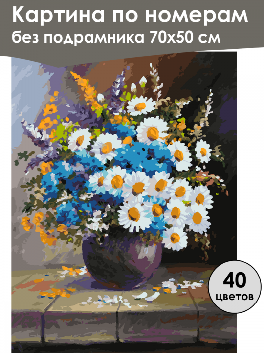 Картина по номерам без подрамника, размер 70х50 см, произведена нами. Она включает 40 оттенков и 2173 контуров, что придаёт ей глубину цвета и плавные переходы. Картина выглядит более ярко и живо. В комплект входит глянцевый лак, которым можно покрыть работу по желанию. Краски имеют хорошую укрывистость, хватает двух проходов что бы закрасить символы на схеме. Так же они сохраняют текстуру мазков, не растекаясь и не разглаживаясь полностью на холсте. При покрытии глянцевым лаком создаётся эффект приближенный к масляной живописи. Краски упакованы герметично, что сохраняет их жидкими. Все необходимые инструменты для начала работы также входят в комплект. Мы не используем экосольвентные чернила, которые содержат свинец и могут быть вредны для здоровья. Наши картины напечатаны безопасными водными пигментными чернилами, обеспечивающими чёткое изображение и легко читаемые обозначения. Холст плотный, имеет мелкую зернистость, легко разглаживается и устойчив к сминанию. Картина поставляется в бурой коробке. Следует отметить, что картина без подрамника её нельзя натянуть на подрамник из-за узких краёв, она предназначена для оформления в рамочку. Большой букет в керамической вазе на поверхности, заполненной разнообразными цветами — белыми ромашками с оранжевыми сердцевинами, голубыми и оранжевыми цветами, окружёнными зелёной листвой, на фоне размытой тёмной стены, что создаёт яркий и жизнерадостный контраст.