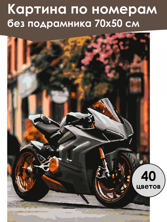 Картина по номерам без подрамника, размер 70х50 см, произведена нами. Она включает 40 оттенков и 2386 контуров, что придаёт ей глубину цвета и плавные переходы. Картина выглядит более ярко и живо. В комплект входит глянцевый лак, которым можно покрыть работу по желанию. Краски имеют хорошую укрывистость, хватает двух проходов что бы закрасить символы на схеме. Так же они сохраняют текстуру мазков, не растекаясь и не разглаживаясь полностью на холсте. При покрытии глянцевым лаком создаётся эффект приближенный к масляной живописи. Краски упакованы герметично, что сохраняет их жидкими. Все необходимые инструменты для начала работы также входят в комплект. Мы не используем экосольвентные чернила, которые содержат свинец и могут быть вредны для здоровья. Наши картины напечатаны безопасными водными пигментными чернилами, обеспечивающими чёткое изображение и легко читаемые обозначения. Холст плотный, имеет мелкую зернистость, легко разглаживается и устойчив к сминанию. Картина поставляется в бурой коробке. Следует отметить, что картина без подрамника её нельзя натянуть на подрамник из-за узких краёв, она предназначена для оформления в рамочку. Яркого спортивный мотоцикл с оранжевыми и серебристыми деталями, стоящий на фоне размытых деревьев и зданий, погружённый в живописные осенние тона.
