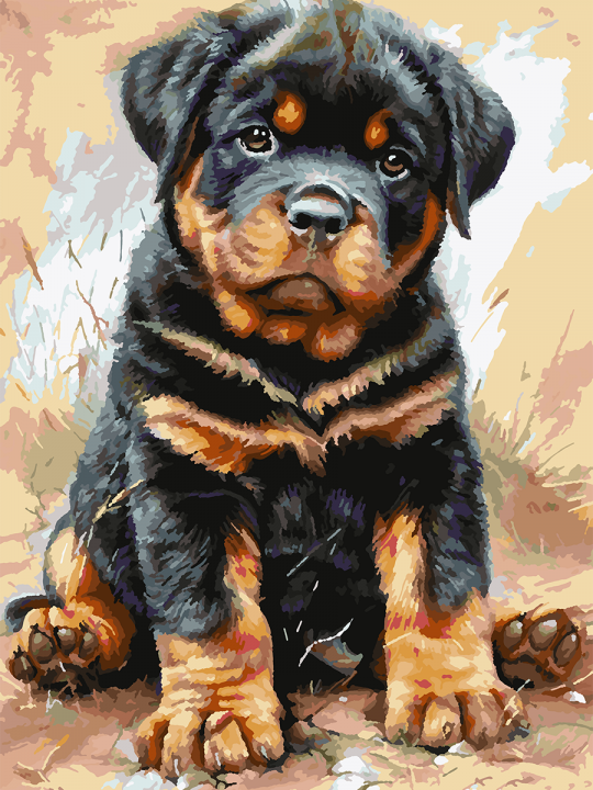 Картина по номерам на подрамнике, размер 70х50 см, произведена нами. Она включает 38 оттенков и 3095 контуров, что придаёт ей глубину цвета и плавные переходы. Картина выглядит более ярко и живо. В комплект входит глянцевый лак, которым можно покрыть работу по желанию. Краски имеют хорошую укрывистость, хватает двух проходов что бы закрасить символы на схеме. Так же они сохраняют текстуру мазков, не растекаясь и не разглаживаясь полностью на холсте. При покрытии глянцевым лаком создаётся эффект приближенный к масляной живописи. Краски упакованы герметично, что сохраняет их жидкими. Все необходимые инструменты для начала работы также включены в комплект, в том числе и крепления на стену. В картине используется крепкий подрамник со специальной вставкой, которая предотвращает провисание холста во время рисования. Это обеспечивает комфортный процесс работы и гарантирует, что холст всегда будет оставаться хорошо натянутым. Мы не используем экосольвентные чернила, которые содержат свинец и могут быть вредны для здоровья. Наши картины напечатаны безопасными водными пигментными чернилами, обеспечивающими чёткое изображение и легко читаемые обозначения. Холст плотный, имеет мелкую зернистость, легко разглаживается и устойчив к сминанию. Картина поставляется в защищённой бурой коробке. Щенок ротвейлера, сидящий и глядящий прямо вперёд, со светлыми и тёмными оттенками шерсти, крупными лапами и внимательным выражением глаз; задний план размытый, с оттенками коричневого и бежевого, создавая мягкую, спокойную атмосферу.