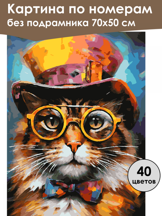 Картина по номерам без подрамника, размер 70х50 см, произведена нами. Она включает 40 оттенков и 2396 контуров, что придаёт ей глубину цвета и плавные переходы. Картина выглядит более ярко и живо. В комплект входит глянцевый лак, которым можно покрыть работу по желанию. Краски имеют хорошую укрывистость, хватает двух проходов что бы закрасить символы на схеме. Так же они сохраняют текстуру мазков, не растекаясь и не разглаживаясь полностью на холсте. При покрытии глянцевым лаком создаётся эффект приближенный к масляной живописи. Краски упакованы герметично, что сохраняет их жидкими. Все необходимые инструменты для начала работы также входят в комплект. Мы не используем экосольвентные чернила, которые содержат свинец и могут быть вредны для здоровья. Наши картины напечатаны безопасными водными пигментными чернилами, обеспечивающими чёткое изображение и легко читаемые обозначения. Холст плотный, имеет мелкую зернистость, легко разглаживается и устойчив к сминанию. Картина поставляется в бурой коробке. Следует отметить, что картина без подрамника её нельзя натянуть на подрамник из-за узких краёв, она предназначена для оформления в рамочку. Стилизованный портрет кота, одетого в яркий цилиндр и круглые очки, с бабочкой на шее; рисунок выполнен в ярких, насыщенных цветах, создающих эффект абстракции.