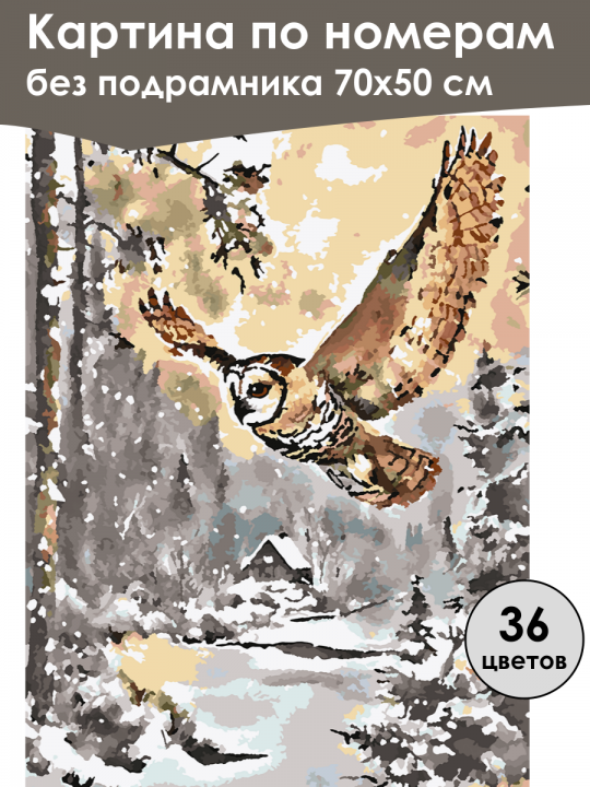 Картина по номерам без подрамника, размер 70х50 см, произведена нами. Она включает 36 оттенков и 3036 контуров, что придаёт ей глубину цвета и плавные переходы. Картина выглядит более ярко и живо. В комплект входит глянцевый лак, которым можно покрыть работу по желанию. Краски имеют хорошую укрывистость, хватает двух проходов что бы закрасить символы на схеме. Так же они сохраняют текстуру мазков, не растекаясь и не разглаживаясь полностью на холсте. При покрытии глянцевым лаком создаётся эффект приближенный к масляной живописи. Краски упакованы герметично, что сохраняет их жидкими. Все необходимые инструменты для начала работы также входят в комплект. Мы не используем экосольвентные чернила, которые содержат свинец и могут быть вредны для здоровья. Наши картины напечатаны безопасными водными пигментными чернилами, обеспечивающими чёткое изображение и легко читаемые обозначения. Холст плотный, имеет мелкую зернистость, легко разглаживается и устойчив к сминанию. Картина поставляется в бурой коробке. Следует отметить, что картина без подрамника её нельзя натянуть на подрамник из-за узких краёв, она предназначена для оформления в рамочку. Стилизованная картина зимнего леса с летящей совой, с широко раскрытыми крыльями в полёте, вокруг разлетаются снежные хлопья, на заднем плане виден заснеженный дом среди деревьев, сцена наполнена тёплыми и холодными оттенками, создающими атмосферу спокойного зимнего вечера.