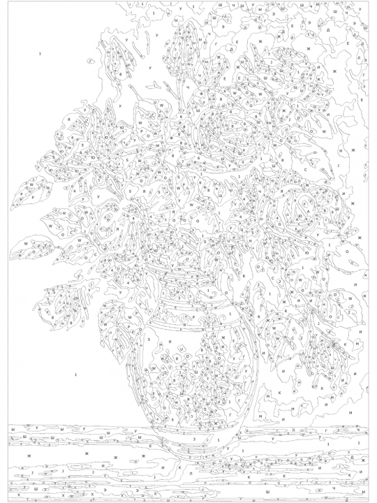 Картина по номерам на подрамнике, размер 35х25 см, произведена нами. Она включает 40 оттенков и 1843 контуров, что придаёт ей глубину цвета и плавные переходы. Картина выглядит более ярко и живо. В комплект входит глянцевый лак, которым можно покрыть работу по желанию. Краски имеют хорошую укрывистость, хватает двух проходов что бы закрасить символы на схеме. Так же они сохраняют текстуру мазков, не растекаясь и не разглаживаясь полностью на холсте. При покрытии глянцевым лаком создаётся эффект приближенный к масляной живописи. Краски упакованы герметично, что сохраняет их жидкими. Все необходимые инструменты для начала работы также включены в комплект, в том числе и крепления на стену. В картине используется крепкий подрамник со специальной вставкой, которая предотвращает провисание холста во время рисования. Это обеспечивает комфортный процесс работы и гарантирует, что холст всегда будет оставаться хорошо натянутым. Мы не используем экосольвентные чернила, которые содержат свинец и могут быть вредны для здоровья. Наши картины напечатаны безопасными водными пигментными чернилами, обеспечивающими чёткое изображение и легко читаемые обозначения. Холст плотный, имеет мелкую зернистость, легко разглаживается и устойчив к сминанию. Картина поставляется в защищённой бурой коробке. Ваза, украшенная рисунками роз, наполненная красными и белыми розами с зелеными листьями на фоне стены теплого оттенка, создающая атмосферу классической натюрмортной композиции.