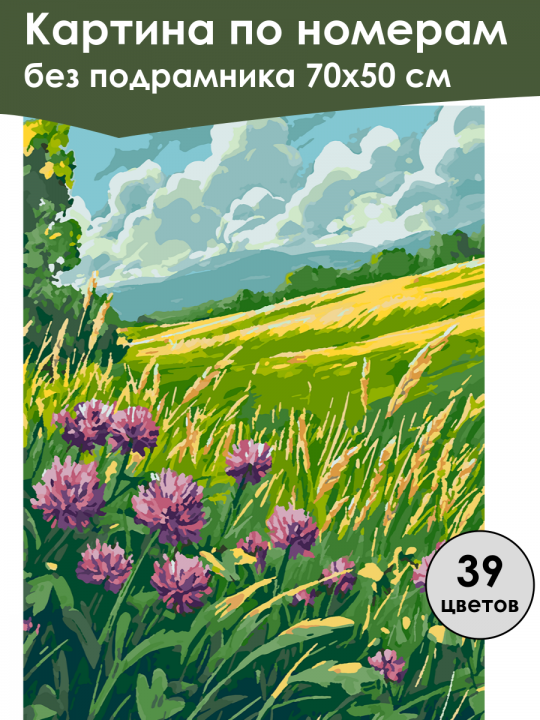 Картина по номерам без подрамника, размер 70х50 см, произведена нами. Она включает 39 оттенков и 2711 контуров, что придаёт ей глубину цвета и плавные переходы. Картина выглядит более ярко и живо. В комплект входит глянцевый лак, которым можно покрыть работу по желанию. Краски имеют хорошую укрывистость, хватает двух проходов что бы закрасить символы на схеме. Так же они сохраняют текстуру мазков, не растекаясь и не разглаживаясь полностью на холсте. При покрытии глянцевым лаком создаётся эффект приближенный к масляной живописи. Краски упакованы герметично, что сохраняет их жидкими. Все необходимые инструменты для начала работы также входят в комплект. Мы не используем экосольвентные чернила, которые содержат свинец и могут быть вредны для здоровья. Наши картины напечатаны безопасными водными пигментными чернилами, обеспечивающими чёткое изображение и легко читаемые обозначения. Холст плотный, имеет мелкую зернистость, легко разглаживается и устойчив к сминанию. Картина поставляется в бурой коробке. Следует отметить, что картина без подрамника её нельзя натянуть на подрамник из-за узких краёв, она предназначена для оформления в рамочку. Живописный пейзаж с зелёным полем и волнистыми жёлтыми травами проходит через центр изображения, на переднем плане цветы клевера в обрамлении свежей зелени, слева вьются высокие деревья, а на заднем плане виднеются тучи на фоне яркого голубого неба.