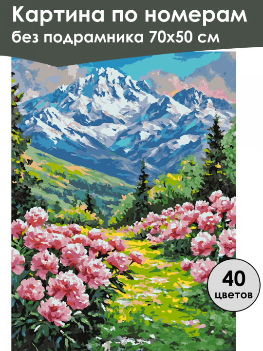 Картина по номерам без подрамника, размер 70х50 см, произведена нами. Она включает 40 оттенков и 3546 контуров, что придаёт ей глубину цвета и плавные переходы. Картина выглядит более ярко и живо. В комплект входит глянцевый лак, которым можно покрыть работу по желанию. Краски имеют хорошую укрывистость, хватает двух проходов что бы закрасить символы на схеме. Так же они сохраняют текстуру мазков, не растекаясь и не разглаживаясь полностью на холсте. При покрытии глянцевым лаком создаётся эффект приближенный к масляной живописи. Краски упакованы герметично, что сохраняет их жидкими. Все необходимые инструменты для начала работы также входят в комплект. Мы не используем экосольвентные чернила, которые содержат свинец и могут быть вредны для здоровья. Наши картины напечатаны безопасными водными пигментными чернилами, обеспечивающими чёткое изображение и легко читаемые обозначения. Холст плотный, имеет мелкую зернистость, легко разглаживается и устойчив к сминанию. Картина поставляется в бурой коробке. Следует отметить, что картина без подрамника её нельзя натянуть на подрамник из-за узких краёв, она предназначена для оформления в рамочку. Красочный пейзаж с живописными горами на заднем плане, покрытыми снегом, под ними расположены зелёные холмы, усаженные цветущими кустами розовых цветов пионов, создающими яркий контраст с синевой неба и белизной вершин; среди зелени выделяются высокие тёмные деревья, а тропинка жёлтого оттенка ведёт взгляд вглубь кадра, усиливая эффект перспективы и вызывая чувство спокойствия и гармонии природы.