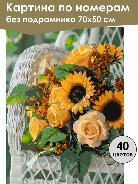 Картина по номерам без подрамника, размер 70х50 см, произведена нами. Она включает 40 оттенков и 3174 контуров, что придаёт ей глубину цвета и плавные переходы. Картина выглядит более ярко и живо. В комплект входит глянцевый лак, которым можно покрыть работу по желанию. Краски имеют хорошую укрывистость, хватает двух проходов что бы закрасить символы на схеме. Так же они сохраняют текстуру мазков, не растекаясь и не разглаживаясь полностью на холсте. При покрытии глянцевым лаком создаётся эффект приближенный к масляной живописи. Краски упакованы герметично, что сохраняет их жидкими. Все необходимые инструменты для начала работы также входят в комплект. Мы не используем экосольвентные чернила, которые содержат свинец и могут быть вредны для здоровья. Наши картины напечатаны безопасными водными пигментными чернилами, обеспечивающими чёткое изображение и легко читаемые обозначения. Холст плотный, имеет мелкую зернистость, легко разглаживается и устойчив к сминанию. Картина поставляется в бурой коробке. Следует отметить, что картина без подрамника её нельзя натянуть на подрамник из-за узких краёв, она предназначена для оформления в рамочку. Букет подсолнухов и розовых цветов с зелёными листьями, расположен на плетёном белом кресле, на фоне зелёной растительности.