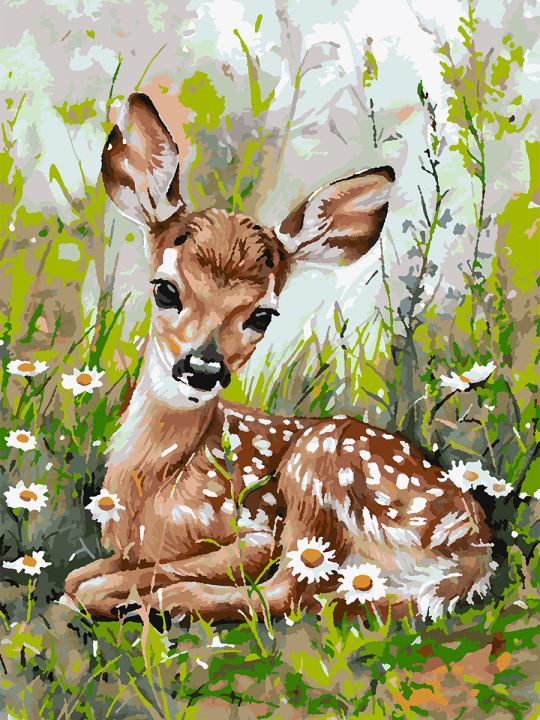 Картина по номерам на подрамнике, размер 70х50 см, произведена нами. Она включает 38 оттенков и 3464 контуров, что придаёт ей глубину цвета и плавные переходы. Картина выглядит более ярко и живо. В комплект входит глянцевый лак, которым можно покрыть работу по желанию. Краски имеют хорошую укрывистость, хватает двух проходов что бы закрасить символы на схеме. Так же они сохраняют текстуру мазков, не растекаясь и не разглаживаясь полностью на холсте. При покрытии глянцевым лаком создаётся эффект приближенный к масляной живописи. Краски упакованы герметично, что сохраняет их жидкими. Все необходимые инструменты для начала работы также включены в комплект, в том числе и крепления на стену. В картине используется крепкий подрамник со специальной вставкой, которая предотвращает провисание холста во время рисования. Это обеспечивает комфортный процесс работы и гарантирует, что холст всегда будет оставаться хорошо натянутым. Мы не используем экосольвентные чернила, которые содержат свинец и могут быть вредны для здоровья. Наши картины напечатаны безопасными водными пигментными чернилами, обеспечивающими чёткое изображение и легко читаемые обозначения. Холст плотный, имеет мелкую зернистость, легко разглаживается и устойчив к сминанию. Картина поставляется в защищённой бурой коробке. Оленёнок, уютно лежащий среди зелёной травы с белыми ромашками, его тело покрыто светлыми пятнышками, большие уши настороженно подняты, а вокруг него размытый зелёный фон из кустов и трав.