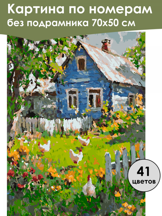 Картина по номерам без подрамника, размер 70х50 см, произведена нами. Она включает 41 оттенков и 4221 контуров, что придаёт ей глубину цвета и плавные переходы. Картина выглядит более ярко и живо. В комплект входит глянцевый лак, которым можно покрыть работу по желанию. Краски имеют хорошую укрывистость, хватает двух проходов что бы закрасить символы на схеме. Так же они сохраняют текстуру мазков, не растекаясь и не разглаживаясь полностью на холсте. При покрытии глянцевым лаком создаётся эффект приближенный к масляной живописи. Краски упакованы герметично, что сохраняет их жидкими. Все необходимые инструменты для начала работы также входят в комплект. Мы не используем экосольвентные чернила, которые содержат свинец и могут быть вредны для здоровья. Наши картины напечатаны безопасными водными пигментными чернилами, обеспечивающими чёткое изображение и легко читаемые обозначения. Холст плотный, имеет мелкую зернистость, легко разглаживается и устойчив к сминанию. Картина поставляется в бурой коробке. Следует отметить, что картина без подрамника её нельзя натянуть на подрамник из-за узких краёв, она предназначена для оформления в рамочку. Живописный сельский пейзаж с ярким синим деревенским домом, окружённым цветущими деревьями и забором, на переднем плане зелёная трава с белыми и коричневыми курицами, создающими уютную и пасторальную картину.