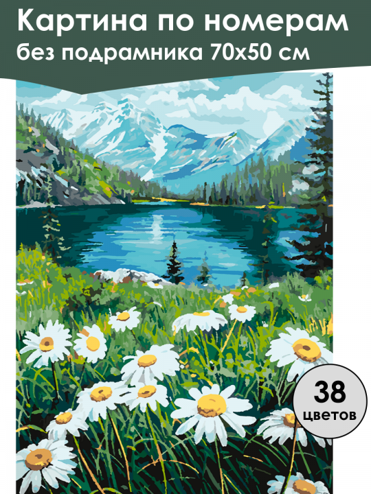 Картина по номерам без подрамника, размер 70х50 см, произведена нами. Она включает 38 оттенков и 3010 контуров, что придаёт ей глубину цвета и плавные переходы. Картина выглядит более ярко и живо. В комплект входит глянцевый лак, которым можно покрыть работу по желанию. Краски имеют хорошую укрывистость, хватает двух проходов что бы закрасить символы на схеме. Так же они сохраняют текстуру мазков, не растекаясь и не разглаживаясь полностью на холсте. При покрытии глянцевым лаком создаётся эффект приближенный к масляной живописи. Краски упакованы герметично, что сохраняет их жидкими. Все необходимые инструменты для начала работы также входят в комплект. Мы не используем экосольвентные чернила, которые содержат свинец и могут быть вредны для здоровья. Наши картины напечатаны безопасными водными пигментными чернилами, обеспечивающими чёткое изображение и легко читаемые обозначения. Холст плотный, имеет мелкую зернистость, легко разглаживается и устойчив к сминанию. Картина поставляется в бурой коробке. Следует отметить, что картина без подрамника её нельзя натянуть на подрамник из-за узких краёв, она предназначена для оформления в рамочку. Живописный пейзаж с ромашковым полем на переднем плане, за которым простирается бирюзовое озеро, окруженное густыми елями и зелеными склонами, а на горизонте виднеются величественные снежные горы под голубым небом с легкими облаками.
