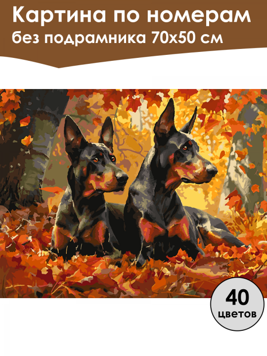 Картина по номерам без подрамника, размер 70х50 см, произведена нами. Она включает 40 оттенков и 3073 контуров, что придаёт ей глубину цвета и плавные переходы. Картина выглядит более ярко и живо. В комплект входит глянцевый лак, которым можно покрыть работу по желанию. Краски имеют хорошую укрывистость, хватает двух проходов что бы закрасить символы на схеме. Так же они сохраняют текстуру мазков, не растекаясь и не разглаживаясь полностью на холсте. При покрытии глянцевым лаком создаётся эффект приближенный к масляной живописи. Краски упакованы герметично, что сохраняет их жидкими. Все необходимые инструменты для начала работы также входят в комплект. Мы не используем экосольвентные чернила, которые содержат свинец и могут быть вредны для здоровья. Наши картины напечатаны безопасными водными пигментными чернилами, обеспечивающими чёткое изображение и легко читаемые обозначения. Холст плотный, имеет мелкую зернистость, легко разглаживается и устойчив к сминанию. Картина поставляется в бурой коробке. Следует отметить, что картина без подрамника её нельзя натянуть на подрамник из-за узких краёв, она предназначена для оформления в рамочку. Два добермана, лежащие на осенних листьях в живописном лесу с яркими оранжевыми и желтыми оттенками листвы, создающих тёплую и уютную атмосферу.