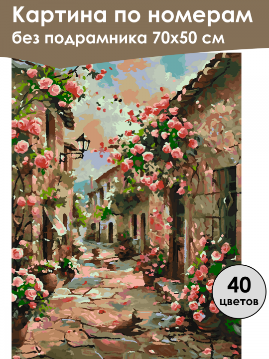 Картина по номерам без подрамника, размер 70х50 см, произведена нами. Она включает 40 оттенков и 4252 контуров, что придаёт ей глубину цвета и плавные переходы. Картина выглядит более ярко и живо. В комплект входит глянцевый лак, которым можно покрыть работу по желанию. Краски имеют хорошую укрывистость, хватает двух проходов что бы закрасить символы на схеме. Так же они сохраняют текстуру мазков, не растекаясь и не разглаживаясь полностью на холсте. При покрытии глянцевым лаком создаётся эффект приближенный к масляной живописи. Краски упакованы герметично, что сохраняет их жидкими. Все необходимые инструменты для начала работы также входят в комплект. Мы не используем экосольвентные чернила, которые содержат свинец и могут быть вредны для здоровья. Наши картины напечатаны безопасными водными пигментными чернилами, обеспечивающими чёткое изображение и легко читаемые обозначения. Холст плотный, имеет мелкую зернистость, легко разглаживается и устойчив к сминанию. Картина поставляется в бурой коробке. Следует отметить, что картина без подрамника её нельзя натянуть на подрамник из-за узких краёв, она предназначена для оформления в рамочку. Живописная уличная сцена в пастельных тонах, где узкая мощёная улочка обрамлена каменными домами, украшенными буйством розовых цветов, вьющихся по фасадам и драпирующихся над арками, под ярким голубым небом с облаками; зелень листвы и тёплый оттенок стен создают атмосферу уюта и спокойствия.