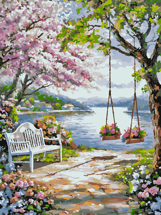 Картина по номерам на подрамнике, размер 70х50 см, произведена нами. Она включает 40 оттенков и 4431 контуров, что придаёт ей глубину цвета и плавные переходы. Картина выглядит более ярко и живо. В комплект входит глянцевый лак, которым можно покрыть работу по желанию. Краски имеют хорошую укрывистость, хватает двух проходов что бы закрасить символы на схеме. Так же они сохраняют текстуру мазков, не растекаясь и не разглаживаясь полностью на холсте. При покрытии глянцевым лаком создаётся эффект приближенный к масляной живописи. Краски упакованы герметично, что сохраняет их жидкими. Все необходимые инструменты для начала работы также включены в комплект, в том числе и крепления на стену. В картине используется крепкий подрамник со специальной вставкой, которая предотвращает провисание холста во время рисования. Это обеспечивает комфортный процесс работы и гарантирует, что холст всегда будет оставаться хорошо натянутым. Мы не используем экосольвентные чернила, которые содержат свинец и могут быть вредны для здоровья. Наши картины напечатаны безопасными водными пигментными чернилами, обеспечивающими чёткое изображение и легко читаемые обозначения. Холст плотный, имеет мелкую зернистость, легко разглаживается и устойчив к сминанию. Картина поставляется в защищённой бурой коробке. Живописная сцена с белой скамейкой на мощёной дорожке рядом с цветущими деревьями с розовыми и зелёными листьями, на фоне тихого озера и гор, деревянные качели висят на дереве, украшенные цветами.