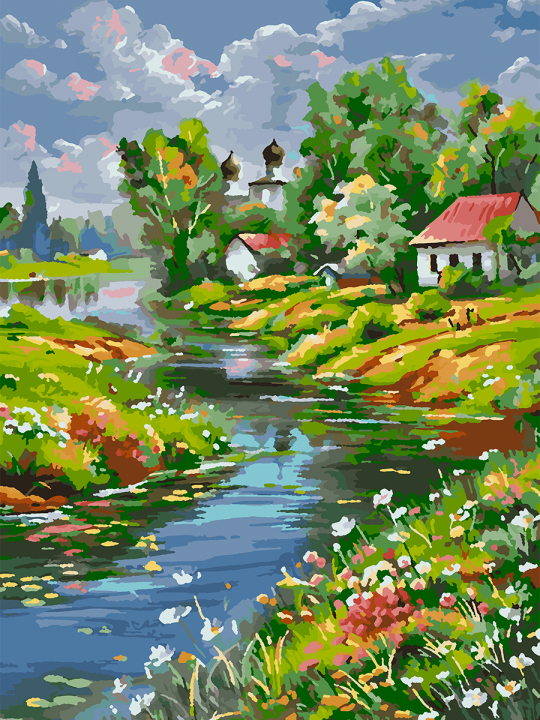 Картина по номерам на подрамнике, размер 70х50 см, произведена нами. Она включает 40 оттенков и 3276 контуров, что придаёт ей глубину цвета и плавные переходы. Картина выглядит более ярко и живо. В комплект входит глянцевый лак, которым можно покрыть работу по желанию. Краски имеют хорошую укрывистость, хватает двух проходов что бы закрасить символы на схеме. Так же они сохраняют текстуру мазков, не растекаясь и не разглаживаясь полностью на холсте. При покрытии глянцевым лаком создаётся эффект приближенный к масляной живописи. Краски упакованы герметично, что сохраняет их жидкими. Все необходимые инструменты для начала работы также включены в комплект, в том числе и крепления на стену. В картине используется крепкий подрамник со специальной вставкой, которая предотвращает провисание холста во время рисования. Это обеспечивает комфортный процесс работы и гарантирует, что холст всегда будет оставаться хорошо натянутым. Мы не используем экосольвентные чернила, которые содержат свинец и могут быть вредны для здоровья. Наши картины напечатаны безопасными водными пигментными чернилами, обеспечивающими чёткое изображение и легко читаемые обозначения. Холст плотный, имеет мелкую зернистость, легко разглаживается и устойчив к сминанию. Картина поставляется в защищённой бурой коробке. Живописная сельская сцена: извивающаяся река с отражением неба в её водах, окружённая пышными кустами и цветущими лугами, ведущими к небольшому белому дому с красной крышей и православному храму с куполами на заднем плане, обрамлённым зелёными деревьями и под розовато-голубыми облаками на фоне.