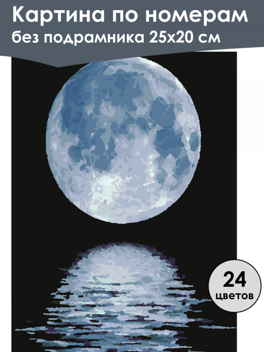 Картина по номерам без подрамника, размер 25х20 см, произведена нами. Она включает 24 оттенков и 737 контуров, что придаёт ей глубину цвета и плавные переходы. Картина выглядит более ярко и живо. В комплект входит глянцевый лак, которым можно покрыть работу по желанию. Краски качественные, имеют хорошую укрывистость, хватает двух проходов что бы закрасить символы на схеме. Они упакованы герметично, что сохраняет их жидкими. Все необходимые инструменты для начала работы также включены в комплект. Мы не используем экосольвентные чернила, которые содержат свинец и могут быть вредны для здоровья. Наши картины напечатаны безопасными водными пигментными чернилами, обеспечивающими чёткое изображение и легко читаемые обозначения. Холст плотный, имеет мелкую зернистость, легко разглаживается и устойчив к сминанию. Картина поставляется в бурой коробке. Следует отметить, что картина без подрамника её нельзя натянуть на подрамник из-за узких краёв, она предназначена для оформления в рамочку. Полная луна в тёмном ночном небе с её отражением в ряби воды, создавая спокойную и мистическую атмосферу.