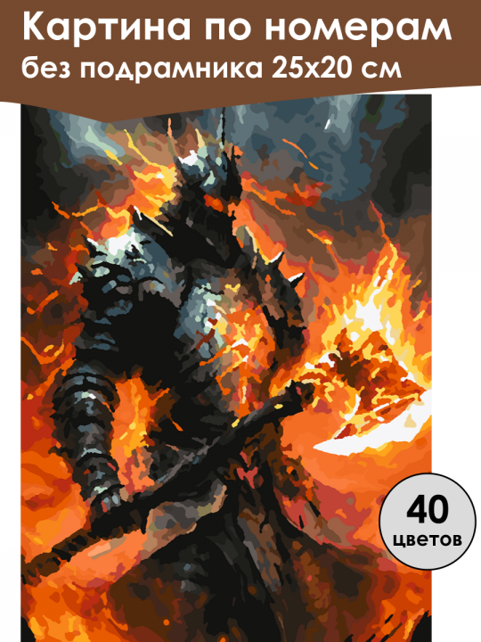 Картина по номерам без подрамника, размер 25х20 см, произведена нами. Она включает 40 оттенков и 1449 контуров, что придаёт ей глубину цвета и плавные переходы. Картина выглядит более ярко и живо. В комплект входит глянцевый лак, которым можно покрыть работу по желанию. Краски качественные, имеют хорошую укрывистость, хватает двух проходов что бы закрасить символы на схеме. Они упакованы герметично, что сохраняет их жидкими. Все необходимые инструменты для начала работы также включены в комплект. Мы не используем экосольвентные чернила, которые содержат свинец и могут быть вредны для здоровья. Наши картины напечатаны безопасными водными пигментными чернилами, обеспечивающими чёткое изображение и легко читаемые обозначения. Холст плотный, имеет мелкую зернистость, легко разглаживается и устойчив к сминанию. Картина поставляется в бурой коробке. Следует отметить, что картина без подрамника её нельзя натянуть на подрамник из-за узких краёв, она предназначена для оформления в рамочку. Монстр в тяжелых доспехах с огненными мотивами и шипами, держащий в руках огромный пылающий молот на фоне бушующего пламени; его фигура окутана языками огня, создающими атмосферу мощи и разрушения.
