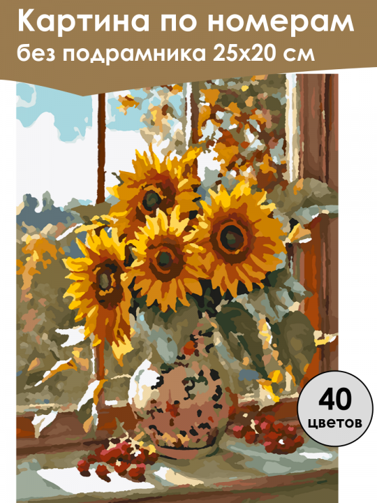 Картина по номерам без подрамника, размер 25х20 см, произведена нами. Она включает 40 оттенков и 1631 контуров, что придаёт ей глубину цвета и плавные переходы. Картина выглядит более ярко и живо. В комплект входит глянцевый лак, которым можно покрыть работу по желанию. Краски качественные, имеют хорошую укрывистость, хватает двух проходов что бы закрасить символы на схеме. Они упакованы герметично, что сохраняет их жидкими. Все необходимые инструменты для начала работы также включены в комплект. Мы не используем экосольвентные чернила, которые содержат свинец и могут быть вредны для здоровья. Наши картины напечатаны безопасными водными пигментными чернилами, обеспечивающими чёткое изображение и легко читаемые обозначения. Холст плотный, имеет мелкую зернистость, легко разглаживается и устойчив к сминанию. Картина поставляется в бурой коробке. Следует отметить, что картина без подрамника её нельзя натянуть на подрамник из-за узких краёв, она предназначена для оформления в рамочку. Натюрморт с подсолнухами в вазе на фоне окна, за которым видно яркое осеннее пейзаж с золотыми листьями; картина выполнена в стиле масляной живописи с мягкими и плавными мазками, создающими уютную и тёплую атмосферу.