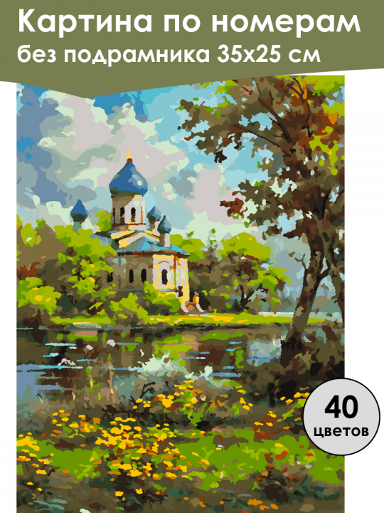 Картина по номерам без подрамника, размер 35х25 см, произведена нами. Она включает 40 оттенков и 2660 контуров, что придаёт ей глубину цвета и плавные переходы. Картина выглядит более ярко и живо. В комплект входит глянцевый лак, которым можно покрыть работу по желанию. Краски качественные, имеют хорошую укрывистость, хватает двух проходов что бы закрасить символы на схеме. Они упакованы герметично, что сохраняет их жидкими. Все необходимые инструменты для начала работы также включены в комплект. Мы не используем экосольвентные чернила, которые содержат свинец и могут быть вредны для здоровья. Наши картины напечатаны безопасными водными пигментными чернилами, обеспечивающими чёткое изображение и легко читаемые обозначения. Холст плотный, имеет мелкую зернистость, легко разглаживается и устойчив к сминанию. Картина поставляется в защищённой бурой коробке. Следует отметить, что картина без подрамника её нельзя натянуть на подрамник из-за узких краёв, она предназначена для оформления в рамочку. Пейзаж с церковью на берегу реки: на переднем плане яркие цветы и трава, справа дерево с густой листвой, на заднем плане церковь с синими куполами и крестами, окружённая зелёными деревьями, в небе летят птицы, а облака мягко очерчивают контуры здания, создавая ощущение спокойствия и гармонии.