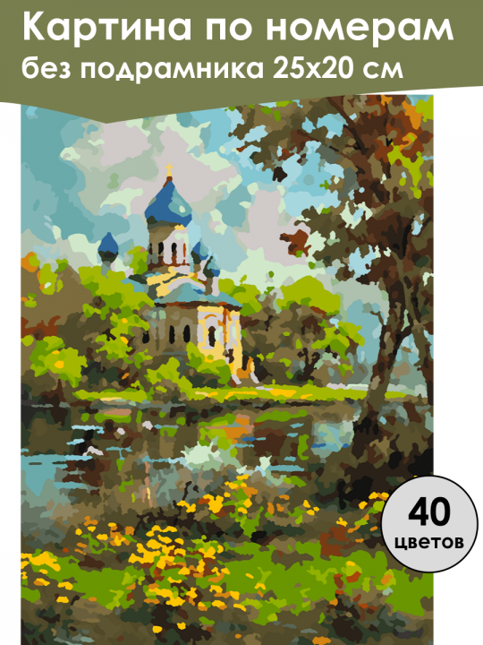 Картина по номерам без подрамника, размер 25х20 см, произведена нами. Она включает 40 оттенков и 1674 контуров, что придаёт ей глубину цвета и плавные переходы. Картина выглядит более ярко и живо. В комплект входит глянцевый лак, которым можно покрыть работу по желанию. Краски качественные, имеют хорошую укрывистость, хватает двух проходов что бы закрасить символы на схеме. Они упакованы герметично, что сохраняет их жидкими. Все необходимые инструменты для начала работы также включены в комплект. Мы не используем экосольвентные чернила, которые содержат свинец и могут быть вредны для здоровья. Наши картины напечатаны безопасными водными пигментными чернилами, обеспечивающими чёткое изображение и легко читаемые обозначения. Холст плотный, имеет мелкую зернистость, легко разглаживается и устойчив к сминанию. Картина поставляется в бурой коробке. Следует отметить, что картина без подрамника её нельзя натянуть на подрамник из-за узких краёв, она предназначена для оформления в рамочку. Пейзаж с церковью на берегу реки: на переднем плане яркие цветы и трава, справа дерево с густой листвой, на заднем плане церковь с синими куполами и крестами, окружённая зелёными деревьями, в небе летят птицы, а облака мягко очерчивают контуры здания, создавая ощущение спокойствия и гармонии.
