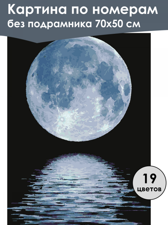 Картина по номерам без подрамника, размер 70х50 см, произведена нами. Она включает 19 оттенков и 1825 контуров, что придаёт ей глубину цвета и плавные переходы. Картина выглядит более ярко и живо. В комплект входит глянцевый лак, которым можно покрыть работу по желанию. Краски имеют хорошую укрывистость, хватает двух проходов что бы закрасить символы на схеме. Так же они сохраняют текстуру мазков, не растекаясь и не разглаживаясь полностью на холсте. При покрытии глянцевым лаком создаётся эффект приближенный к масляной живописи. Краски упакованы герметично, что сохраняет их жидкими. Все необходимые инструменты для начала работы также входят в комплект. Мы не используем экосольвентные чернила, которые содержат свинец и могут быть вредны для здоровья. Наши картины напечатаны безопасными водными пигментными чернилами, обеспечивающими чёткое изображение и легко читаемые обозначения. Холст плотный, имеет мелкую зернистость, легко разглаживается и устойчив к сминанию. Картина поставляется в бурой коробке. Следует отметить, что картина без подрамника её нельзя натянуть на подрамник из-за узких краёв, она предназначена для оформления в рамочку. Полная луна в тёмном ночном небе с её отражением в ряби воды, создавая спокойную и мистическую атмосферу.