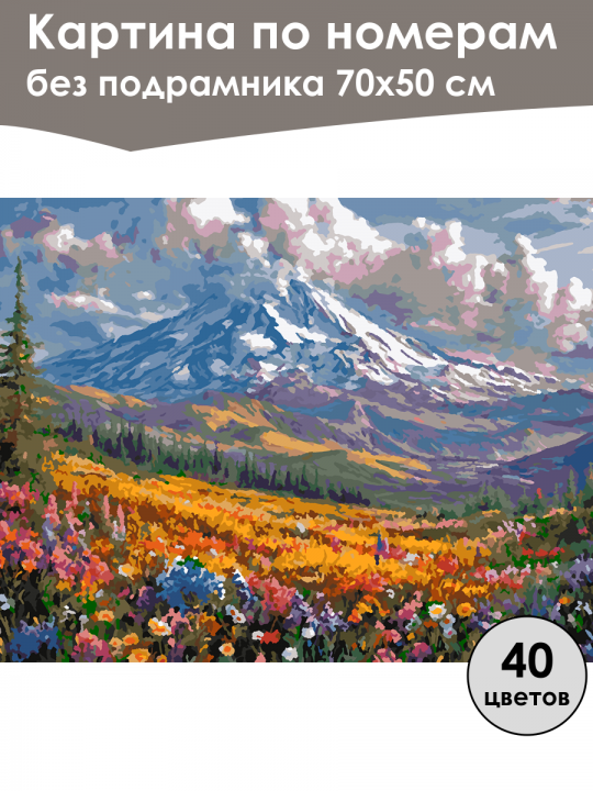 Картина по номерам без подрамника, размер 70х50 см, произведена нами. Она включает 40 оттенков и 3415 контуров, что придаёт ей глубину цвета и плавные переходы. Картина выглядит более ярко и живо. В комплект входит глянцевый лак, которым можно покрыть работу по желанию. Краски имеют хорошую укрывистость, хватает двух проходов что бы закрасить символы на схеме. Так же они сохраняют текстуру мазков, не растекаясь и не разглаживаясь полностью на холсте. При покрытии глянцевым лаком создаётся эффект приближенный к масляной живописи. Краски упакованы герметично, что сохраняет их жидкими. Все необходимые инструменты для начала работы также входят в комплект. Мы не используем экосольвентные чернила, которые содержат свинец и могут быть вредны для здоровья. Наши картины напечатаны безопасными водными пигментными чернилами, обеспечивающими чёткое изображение и легко читаемые обозначения. Холст плотный, имеет мелкую зернистость, легко разглаживается и устойчив к сминанию. Картина поставляется в бурой коробке. Следует отметить, что картина без подрамника её нельзя натянуть на подрамник из-за узких краёв, она предназначена для оформления в рамочку. Горный пейзаж с заснеженной вершиной на фоне, под которым простирается поле ярких цветущих лугов, разделённых полосами зелени и золотистыми оттенками трав, сочетающимися с насыщенными синими и фиолетовыми тенями гор, с клубящимися облаками над головой.