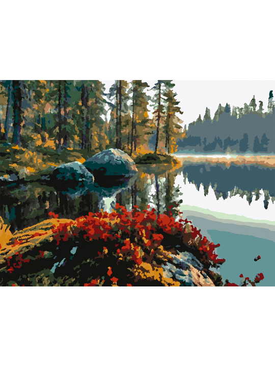 Картина по номерам на подрамнике, размер 35х25 см, произведена нами. Она включает 40 оттенков и 2361 контуров, что придаёт ей глубину цвета и плавные переходы. Картина выглядит более ярко и живо. В комплект входит глянцевый лак, которым можно покрыть работу по желанию. Краски имеют хорошую укрывистость, хватает двух проходов что бы закрасить символы на схеме. Так же они сохраняют текстуру мазков, не растекаясь и не разглаживаясь полностью на холсте. При покрытии глянцевым лаком создаётся эффект приближенный к масляной живописи. Краски упакованы герметично, что сохраняет их жидкими. Все необходимые инструменты для начала работы также включены в комплект, в том числе и крепления на стену. В картине используется крепкий подрамник со специальной вставкой, которая предотвращает провисание холста во время рисования. Это обеспечивает комфортный процесс работы и гарантирует, что холст всегда будет оставаться хорошо натянутым. Мы не используем экосольвентные чернила, которые содержат свинец и могут быть вредны для здоровья. Наши картины напечатаны безопасными водными пигментными чернилами, обеспечивающими чёткое изображение и легко читаемые обозначения. Холст плотный, имеет мелкую зернистость, легко разглаживается и устойчив к сминанию. Картина поставляется в защищённой бурой коробке. Пейзаж в стиле цифровой живописи, где в центре внимания лесное озеро, отражающее высокие сосны с зелеными и желто-оранжевыми листьями, берег окружен камнями и яркими красными кустарниками, создающими контрастные акценты, а дальний план теряется в легкой дымке, делая картину гармоничной и спокойной.