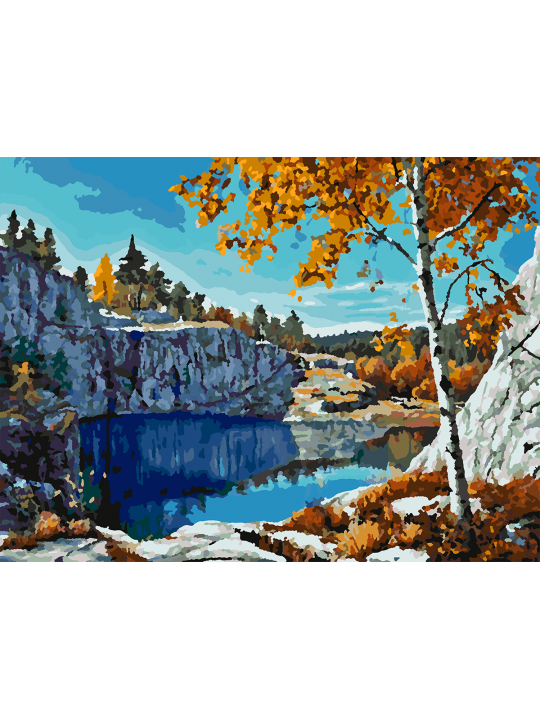 Картина по номерам на подрамнике, размер 35х25 см, произведена нами. Она включает 40 оттенков и 2878 контуров, что придаёт ей глубину цвета и плавные переходы. Картина выглядит более ярко и живо. В комплект входит глянцевый лак, которым можно покрыть работу по желанию. Краски имеют хорошую укрывистость, хватает двух проходов что бы закрасить символы на схеме. Так же они сохраняют текстуру мазков, не растекаясь и не разглаживаясь полностью на холсте. При покрытии глянцевым лаком создаётся эффект приближенный к масляной живописи. Краски упакованы герметично, что сохраняет их жидкими. Все необходимые инструменты для начала работы также включены в комплект, в том числе и крепления на стену. В картине используется крепкий подрамник со специальной вставкой, которая предотвращает провисание холста во время рисования. Это обеспечивает комфортный процесс работы и гарантирует, что холст всегда будет оставаться хорошо натянутым. Мы не используем экосольвентные чернила, которые содержат свинец и могут быть вредны для здоровья. Наши картины напечатаны безопасными водными пигментными чернилами, обеспечивающими чёткое изображение и легко читаемые обозначения. Холст плотный, имеет мелкую зернистость, легко разглаживается и устойчив к сминанию. Картина поставляется в защищённой бурой коробке. Живописный осенний пейзаж: голубое небо, скалистые утёсы, спокойная поверхность воды, отражающая яркие осенние листья деревьев с золотистой листвой, стоящих на переднем плане; деревья и кустарники на заднем фоне добавляют глубину картине.