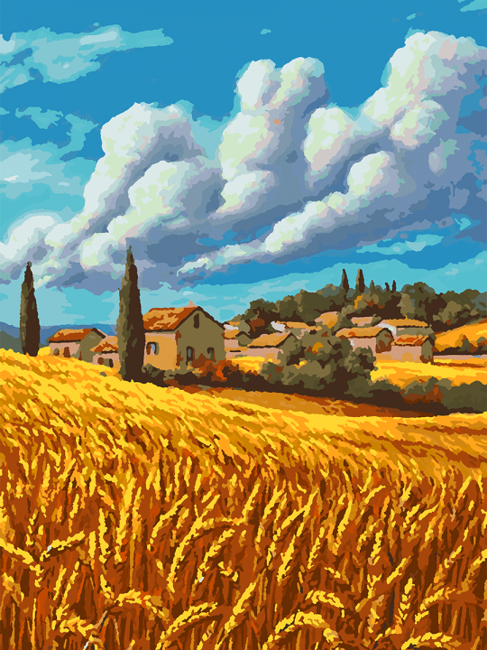 Картина по номерам на подрамнике, размер 70х50 см, произведена нами. Она включает 40 оттенков и 2802 контуров, что придаёт ей глубину цвета и плавные переходы. Картина выглядит более ярко и живо. В комплект входит глянцевый лак, которым можно покрыть работу по желанию. Краски имеют хорошую укрывистость, хватает двух проходов что бы закрасить символы на схеме. Так же они сохраняют текстуру мазков, не растекаясь и не разглаживаясь полностью на холсте. При покрытии глянцевым лаком создаётся эффект приближенный к масляной живописи. Краски упакованы герметично, что сохраняет их жидкими. Все необходимые инструменты для начала работы также включены в комплект, в том числе и крепления на стену. В картине используется крепкий подрамник со специальной вставкой, которая предотвращает провисание холста во время рисования. Это обеспечивает комфортный процесс работы и гарантирует, что холст всегда будет оставаться хорошо натянутым. Мы не используем экосольвентные чернила, которые содержат свинец и могут быть вредны для здоровья. Наши картины напечатаны безопасными водными пигментными чернилами, обеспечивающими чёткое изображение и легко читаемые обозначения. Холст плотный, имеет мелкую зернистость, легко разглаживается и устойчив к сминанию. Картина поставляется в защищённой бурой коробке. Живописный сельский пейзаж с золотыми пшеничными полями на переднем плане, где видны зрелые колосья. На фоне видны небольшие дома с красными крышами, окруженные кипарисами и деревьями, всё это дополняет холмистый ландшафт. Небо яркое и голубое с большими белыми облаками, создающими контраст с золотыми тонами пшеницы.