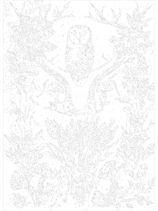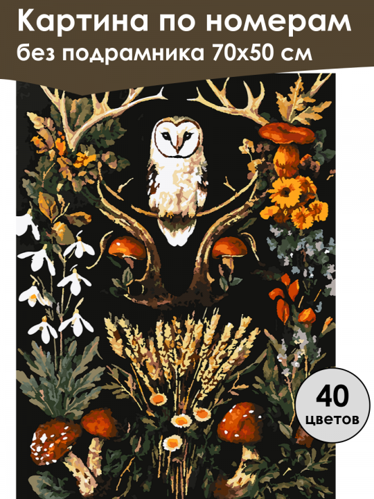 Картина по номерам без подрамника, размер 70х50 см, произведена нами. Она включает 40 оттенков и 2492 контуров, что придаёт ей глубину цвета и плавные переходы. Картина выглядит более ярко и живо. В комплект входит глянцевый лак, которым можно покрыть работу по желанию. Краски имеют хорошую укрывистость, хватает двух проходов что бы закрасить символы на схеме. Так же они сохраняют текстуру мазков, не растекаясь и не разглаживаясь полностью на холсте. При покрытии глянцевым лаком создаётся эффект приближенный к масляной живописи. Краски упакованы герметично, что сохраняет их жидкими. Все необходимые инструменты для начала работы также входят в комплект. Мы не используем экосольвентные чернила, которые содержат свинец и могут быть вредны для здоровья. Наши картины напечатаны безопасными водными пигментными чернилами, обеспечивающими чёткое изображение и легко читаемые обозначения. Холст плотный, имеет мелкую зернистость, легко разглаживается и устойчив к сминанию. Картина поставляется в бурой коробке. Следует отметить, что картина без подрамника её нельзя натянуть на подрамник из-за узких краёв, она предназначена для оформления в рамочку. Сова сидит на ветвях с рогами, окружённая разнообразными растениями и грибами; на тёмном фоне контрастируют белые подснежники, оранжевые и жёлтые цветы, коричневые грибы и золотистые колосья.