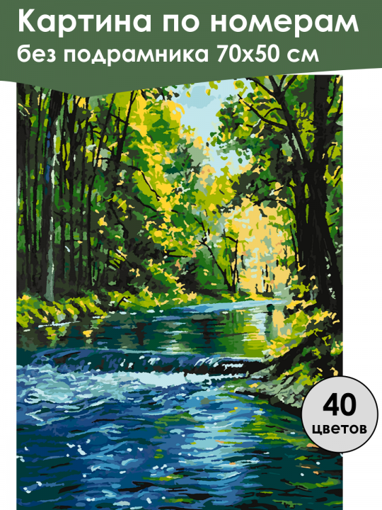 Картина по номерам без подрамника, размер 70х50 см, произведена нами. Она включает 40 оттенков и 3683 контуров, что придаёт ей глубину цвета и плавные переходы. Картина выглядит более ярко и живо. В комплект входит глянцевый лак, которым можно покрыть работу по желанию. Краски имеют хорошую укрывистость, хватает двух проходов что бы закрасить символы на схеме. Так же они сохраняют текстуру мазков, не растекаясь и не разглаживаясь полностью на холсте. При покрытии глянцевым лаком создаётся эффект приближенный к масляной живописи. Краски упакованы герметично, что сохраняет их жидкими. Все необходимые инструменты для начала работы также входят в комплект. Мы не используем экосольвентные чернила, которые содержат свинец и могут быть вредны для здоровья. Наши картины напечатаны безопасными водными пигментными чернилами, обеспечивающими чёткое изображение и легко читаемые обозначения. Холст плотный, имеет мелкую зернистость, легко разглаживается и устойчив к сминанию. Картина поставляется в бурой коробке. Следует отметить, что картина без подрамника её нельзя натянуть на подрамник из-за узких краёв, она предназначена для оформления в рамочку. Живописная сцена лесного пейзажа с рекой на переднем плане; вода в реке окрашена в разнообразные оттенки синего и зелёного, отражая окружающие деревья, обличённые в яркие зелёные и жёлтые оттенки листвы под солнечным светом.