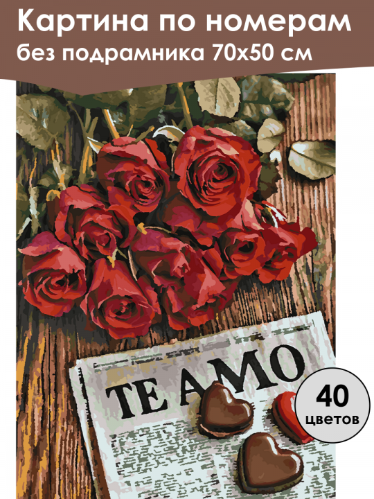 Картина по номерам без подрамника, размер 70х50 см, произведена нами. Она включает 40 оттенков и 3655 контуров, что придаёт ей глубину цвета и плавные переходы. Картина выглядит более ярко и живо. В комплект входит глянцевый лак, которым можно покрыть работу по желанию. Краски имеют хорошую укрывистость, хватает двух проходов что бы закрасить символы на схеме. Так же они сохраняют текстуру мазков, не растекаясь и не разглаживаясь полностью на холсте. При покрытии глянцевым лаком создаётся эффект приближенный к масляной живописи. Краски упакованы герметично, что сохраняет их жидкими. Все необходимые инструменты для начала работы также входят в комплект. Мы не используем экосольвентные чернила, которые содержат свинец и могут быть вредны для здоровья. Наши картины напечатаны безопасными водными пигментными чернилами, обеспечивающими чёткое изображение и легко читаемые обозначения. Холст плотный, имеет мелкую зернистость, легко разглаживается и устойчив к сминанию. Картина поставляется в бурой коробке. Следует отметить, что картина без подрамника её нельзя натянуть на подрамник из-за узких краёв, она предназначена для оформления в рамочку. Букет из красных роз на деревянной поверхности, рядом расположены печенье в форме сердец и газета с надписью "TE AMO".