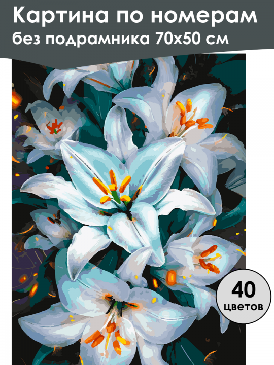 Картина по номерам без подрамника, размер 70х50 см, произведена нами. Она включает 40 оттенков и 2166 контуров, что придаёт ей глубину цвета и плавные переходы. Картина выглядит более ярко и живо. В комплект входит глянцевый лак, которым можно покрыть работу по желанию. Краски имеют хорошую укрывистость, хватает двух проходов что бы закрасить символы на схеме. Так же они сохраняют текстуру мазков, не растекаясь и не разглаживаясь полностью на холсте. При покрытии глянцевым лаком создаётся эффект приближенный к масляной живописи. Краски упакованы герметично, что сохраняет их жидкими. Все необходимые инструменты для начала работы также входят в комплект. Мы не используем экосольвентные чернила, которые содержат свинец и могут быть вредны для здоровья. Наши картины напечатаны безопасными водными пигментными чернилами, обеспечивающими чёткое изображение и легко читаемые обозначения. Холст плотный, имеет мелкую зернистость, легко разглаживается и устойчив к сминанию. Картина поставляется в бурой коробке. Следует отметить, что картина без подрамника её нельзя натянуть на подрамник из-за узких краёв, она предназначена для оформления в рамочку. Белые лилии с насыщенными оранжевыми тычинками на фоне темной зелени. Цветы расположены плотной группой, создавая впечатление густого цветового потока. Лепестки источают нежные оттенки голубого и белого, которые плавно переходят друг в друга, а оранжевые элементы добавляют контраста и яркости. Тёмный фон служит идеальным контрапунктом, подчеркивая изящность и свежесть цветов, создавая атмосферу спокойствия и естественной красоты.