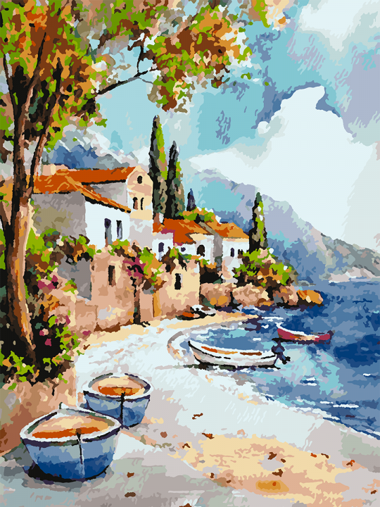 Картина по номерам на подрамнике, размер 70х50 см, произведена нами. Она включает 40 оттенков и 2717 контуров, что придаёт ей глубину цвета и плавные переходы. Картина выглядит более ярко и живо. В комплект входит глянцевый лак, которым можно покрыть работу по желанию. Краски имеют хорошую укрывистость, хватает двух проходов что бы закрасить символы на схеме. Так же они сохраняют текстуру мазков, не растекаясь и не разглаживаясь полностью на холсте. При покрытии глянцевым лаком создаётся эффект приближенный к масляной живописи. Краски упакованы герметично, что сохраняет их жидкими. Все необходимые инструменты для начала работы также включены в комплект, в том числе и крепления на стену. В картине используется крепкий подрамник со специальной вставкой, которая предотвращает провисание холста во время рисования. Это обеспечивает комфортный процесс работы и гарантирует, что холст всегда будет оставаться хорошо натянутым. Мы не используем экосольвентные чернила, которые содержат свинец и могут быть вредны для здоровья. Наши картины напечатаны безопасными водными пигментными чернилами, обеспечивающими чёткое изображение и легко читаемые обозначения. Холст плотный, имеет мелкую зернистость, легко разглаживается и устойчив к сминанию. Картина поставляется в защищённой бурой коробке. Живописный прибрежный пейзаж в стиле импрессионизма: на переднем плане берег с лодками, обрамлённый деревьями с осенней листвой, вдоль линии берега тянутся белые домики с красными крышами, на горизонте виднеются горы, по краям изображение акцентировано морским пейзажем и ярким облачным небом.