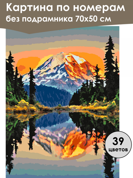 Картина по номерам без подрамника, размер 70х50 см, произведена нами. Она включает 39 оттенков и 1829 контуров, что придаёт ей глубину цвета и плавные переходы. Картина выглядит более ярко и живо. В комплект входит глянцевый лак, которым можно покрыть работу по желанию. Краски имеют хорошую укрывистость, хватает двух проходов что бы закрасить символы на схеме. Так же они сохраняют текстуру мазков, не растекаясь и не разглаживаясь полностью на холсте. При покрытии глянцевым лаком создаётся эффект приближенный к масляной живописи. Краски упакованы герметично, что сохраняет их жидкими. Все необходимые инструменты для начала работы также входят в комплект. Мы не используем экосольвентные чернила, которые содержат свинец и могут быть вредны для здоровья. Наши картины напечатаны безопасными водными пигментными чернилами, обеспечивающими чёткое изображение и легко читаемые обозначения. Холст плотный, имеет мелкую зернистость, легко разглаживается и устойчив к сминанию. Картина поставляется в бурой коробке. Следует отметить, что картина без подрамника её нельзя натянуть на подрамник из-за узких краёв, она предназначена для оформления в рамочку. Цветной пейзаж с высокой горой на фоне яркого заката, отражающийся в гладкой поверхности озера. Горные вершины окрашены в насыщенные оранжевые и синие оттенки, окружены силуэтами высоких елей.