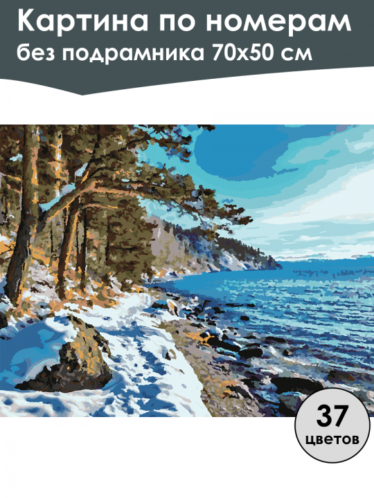 Картина по номерам без подрамника, размер 70х50 см, произведена нами. Она включает 37 оттенков и 3314 контуров, что придаёт ей глубину цвета и плавные переходы. Картина выглядит более ярко и живо. В комплект входит глянцевый лак, которым можно покрыть работу по желанию. Краски имеют хорошую укрывистость, хватает двух проходов что бы закрасить символы на схеме. Так же они сохраняют текстуру мазков, не растекаясь и не разглаживаясь полностью на холсте. При покрытии глянцевым лаком создаётся эффект приближенный к масляной живописи. Краски упакованы герметично, что сохраняет их жидкими. Все необходимые инструменты для начала работы также входят в комплект. Мы не используем экосольвентные чернила, которые содержат свинец и могут быть вредны для здоровья. Наши картины напечатаны безопасными водными пигментными чернилами, обеспечивающими чёткое изображение и легко читаемые обозначения. Холст плотный, имеет мелкую зернистость, легко разглаживается и устойчив к сминанию. Картина поставляется в бурой коробке. Следует отметить, что картина без подрамника её нельзя натянуть на подрамник из-за узких краёв, она предназначена для оформления в рамочку. Зимний берег с заснеженными деревьями, склоняющимися к морю, в котором спокойные синие волны отражают свет; вдалеке виднеются лесистые холмы под ясным голубым небом.
