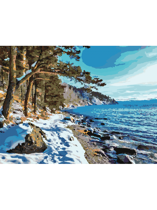 Картина по номерам на подрамнике, размер 70х50 см, произведена нами. Она включает 37 оттенков и 3314 контуров, что придаёт ей глубину цвета и плавные переходы. Картина выглядит более ярко и живо. В комплект входит глянцевый лак, которым можно покрыть работу по желанию. Краски имеют хорошую укрывистость, хватает двух проходов что бы закрасить символы на схеме. Так же они сохраняют текстуру мазков, не растекаясь и не разглаживаясь полностью на холсте. При покрытии глянцевым лаком создаётся эффект приближенный к масляной живописи. Краски упакованы герметично, что сохраняет их жидкими. Все необходимые инструменты для начала работы также включены в комплект, в том числе и крепления на стену. В картине используется крепкий подрамник со специальной вставкой, которая предотвращает провисание холста во время рисования. Это обеспечивает комфортный процесс работы и гарантирует, что холст всегда будет оставаться хорошо натянутым. Мы не используем экосольвентные чернила, которые содержат свинец и могут быть вредны для здоровья. Наши картины напечатаны безопасными водными пигментными чернилами, обеспечивающими чёткое изображение и легко читаемые обозначения. Холст плотный, имеет мелкую зернистость, легко разглаживается и устойчив к сминанию. Картина поставляется в защищённой бурой коробке. Зимний берег с заснеженными деревьями, склоняющимися к морю, в котором спокойные синие волны отражают свет; вдалеке виднеются лесистые холмы под ясным голубым небом.