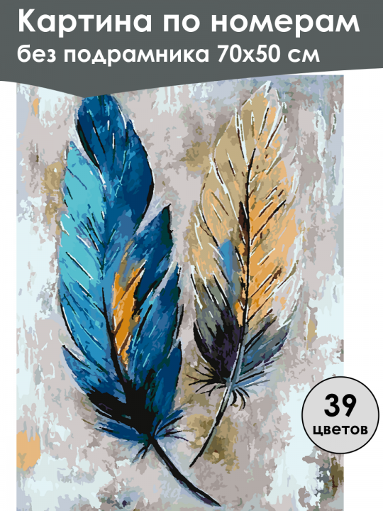 Картина по номерам без подрамника, размер 70х50 см, произведена нами. Она включает 39 оттенков и 2735 контуров, что придаёт ей глубину цвета и плавные переходы. Картина выглядит более ярко и живо. В комплект входит глянцевый лак, которым можно покрыть работу по желанию. Краски имеют хорошую укрывистость, хватает двух проходов что бы закрасить символы на схеме. Так же они сохраняют текстуру мазков, не растекаясь и не разглаживаясь полностью на холсте. При покрытии глянцевым лаком создаётся эффект приближенный к масляной живописи. Краски упакованы герметично, что сохраняет их жидкими. Все необходимые инструменты для начала работы также входят в комплект. Мы не используем экосольвентные чернила, которые содержат свинец и могут быть вредны для здоровья. Наши картины напечатаны безопасными водными пигментными чернилами, обеспечивающими чёткое изображение и легко читаемые обозначения. Холст плотный, имеет мелкую зернистость, легко разглаживается и устойчив к сминанию. Картина поставляется в бурой коробке. Следует отметить, что картина без подрамника её нельзя натянуть на подрамник из-за узких краёв, она предназначена для оформления в рамочку. Два стилизованных пера с художественным подходом: левое перо ярко-синее с вкраплениями оранжевого и черного, правое — бежево-желтое с черными штрихами; оба пера расположены на текстурированном фоне с пастельными серыми и бежевыми оттенками, создавая абстрактное, выразительное изображение.