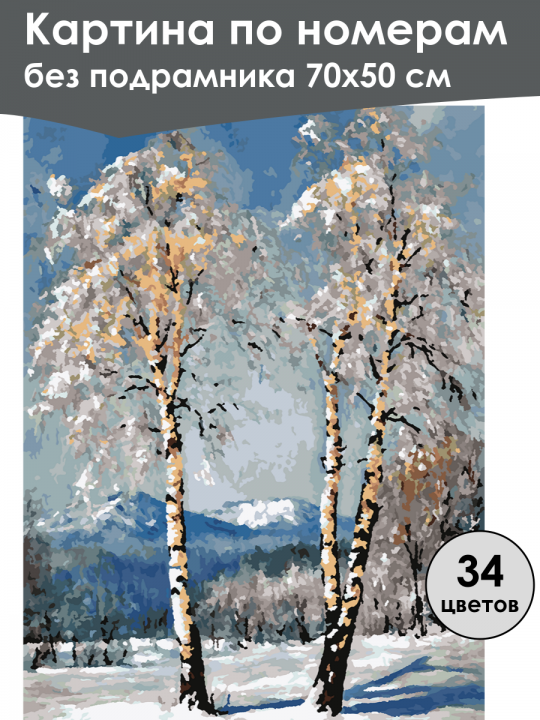 Картина по номерам без подрамника, размер 70х50 см, произведена нами. Она включает 34 оттенков и 3723 контуров, что придаёт ей глубину цвета и плавные переходы. Картина выглядит более ярко и живо. В комплект входит глянцевый лак, которым можно покрыть работу по желанию. Краски имеют хорошую укрывистость, хватает двух проходов что бы закрасить символы на схеме. Так же они сохраняют текстуру мазков, не растекаясь и не разглаживаясь полностью на холсте. При покрытии глянцевым лаком создаётся эффект приближенный к масляной живописи. Краски упакованы герметично, что сохраняет их жидкими. Все необходимые инструменты для начала работы также входят в комплект. Мы не используем экосольвентные чернила, которые содержат свинец и могут быть вредны для здоровья. Наши картины напечатаны безопасными водными пигментными чернилами, обеспечивающими чёткое изображение и легко читаемые обозначения. Холст плотный, имеет мелкую зернистость, легко разглаживается и устойчив к сминанию. Картина поставляется в бурой коробке. Следует отметить, что картина без подрамника её нельзя натянуть на подрамник из-за узких краёв, она предназначена для оформления в рамочку. Два покрытые снегом дерева на фоне зимнего пейзажа, с заснеженными горами вдали и ясным голубым небом, создающим атмосферу спокойствия и зимней свежести.
