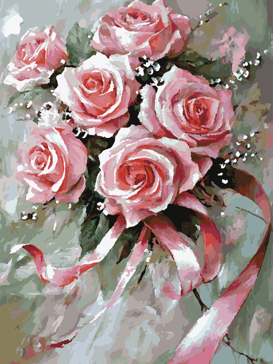 Картина по номерам на подрамнике, размер 70х50 см, произведена нами. Она включает 40 оттенков и 3004 контуров, что придаёт ей глубину цвета и плавные переходы. Картина выглядит более ярко и живо. В комплект входит глянцевый лак, которым можно покрыть работу по желанию. Краски имеют хорошую укрывистость, хватает двух проходов что бы закрасить символы на схеме. Так же они сохраняют текстуру мазков, не растекаясь и не разглаживаясь полностью на холсте. При покрытии глянцевым лаком создаётся эффект приближенный к масляной живописи. Краски упакованы герметично, что сохраняет их жидкими. Все необходимые инструменты для начала работы также включены в комплект, в том числе и крепления на стену. В картине используется крепкий подрамник со специальной вставкой, которая предотвращает провисание холста во время рисования. Это обеспечивает комфортный процесс работы и гарантирует, что холст всегда будет оставаться хорошо натянутым. Мы не используем экосольвентные чернила, которые содержат свинец и могут быть вредны для здоровья. Наши картины напечатаны безопасными водными пигментными чернилами, обеспечивающими чёткое изображение и легко читаемые обозначения. Холст плотный, имеет мелкую зернистость, легко разглаживается и устойчив к сминанию. Картина поставляется в защищённой бурой коробке. Художественный рисунок, на котором изображён букет из пяти розовых роз, дополненный мелкими белыми цветочками и декорированный розовыми лентами на фоне приглушённой зелени.