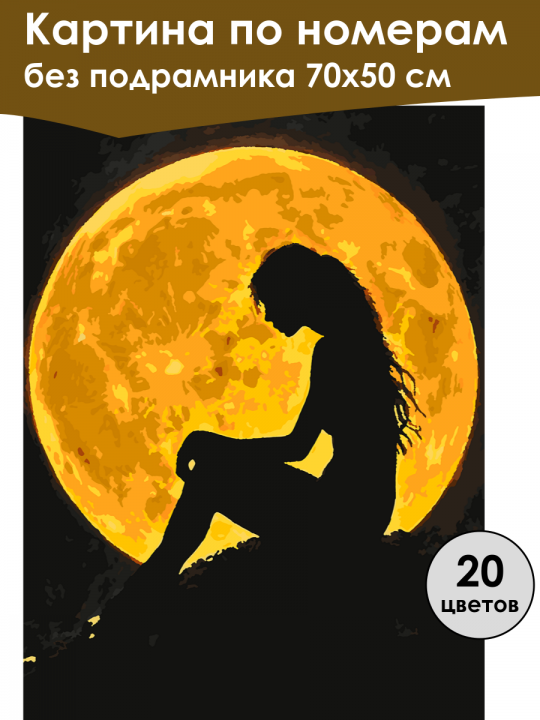 Картина по номерам без подрамника, размер 70х50 см, произведена нами. Она включает 20 оттенков и 623 контуров, что придаёт ей глубину цвета и плавные переходы. Картина выглядит более ярко и живо. В комплект входит глянцевый лак, которым можно покрыть работу по желанию. Краски имеют хорошую укрывистость, хватает двух проходов что бы закрасить символы на схеме. Так же они сохраняют текстуру мазков, не растекаясь и не разглаживаясь полностью на холсте. При покрытии глянцевым лаком создаётся эффект приближенный к масляной живописи. Краски упакованы герметично, что сохраняет их жидкими. Все необходимые инструменты для начала работы также входят в комплект. Мы не используем экосольвентные чернила, которые содержат свинец и могут быть вредны для здоровья. Наши картины напечатаны безопасными водными пигментными чернилами, обеспечивающими чёткое изображение и легко читаемые обозначения. Холст плотный, имеет мелкую зернистость, легко разглаживается и устойчив к сминанию. Картина поставляется в бурой коробке. Следует отметить, что картина без подрамника её нельзя натянуть на подрамник из-за узких краёв, она предназначена для оформления в рамочку. Силуэт девушки сидящей в позе задумчивости с длинными волосами перед яркой большой луной в ночном небе, создающий контраст между тёмными и светлыми элементами картины.