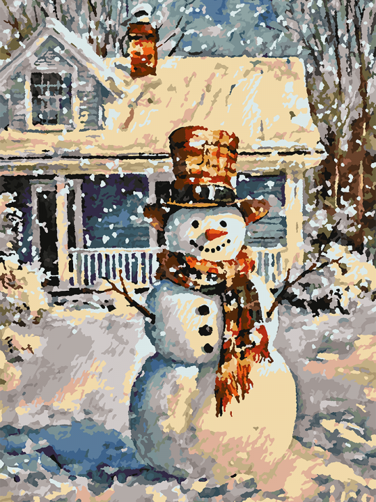 Картина по номерам на подрамнике, размер 70х50 см, произведена нами. Она включает 40 оттенков и 3856 контуров, что придаёт ей глубину цвета и плавные переходы. Картина выглядит более ярко и живо. В комплект входит глянцевый лак, которым можно покрыть работу по желанию. Краски имеют хорошую укрывистость, хватает двух проходов что бы закрасить символы на схеме. Так же они сохраняют текстуру мазков, не растекаясь и не разглаживаясь полностью на холсте. При покрытии глянцевым лаком создаётся эффект приближенный к масляной живописи. Краски упакованы герметично, что сохраняет их жидкими. Все необходимые инструменты для начала работы также включены в комплект, в том числе и крепления на стену. В картине используется крепкий подрамник со специальной вставкой, которая предотвращает провисание холста во время рисования. Это обеспечивает комфортный процесс работы и гарантирует, что холст всегда будет оставаться хорошо натянутым. Мы не используем экосольвентные чернила, которые содержат свинец и могут быть вредны для здоровья. Наши картины напечатаны безопасными водными пигментными чернилами, обеспечивающими чёткое изображение и легко читаемые обозначения. Холст плотный, имеет мелкую зернистость, легко разглаживается и устойчив к сминанию. Картина поставляется в защищённой бурой коробке. Иллюстрированный снеговик с морковным носом и пуговицами, украшенный полосатым шарфом и клетчатой шляпой, стоящий перед домом с заснеженной крышей и трубой, окружённым снежным пейзажем и деревьями на заднем плане.