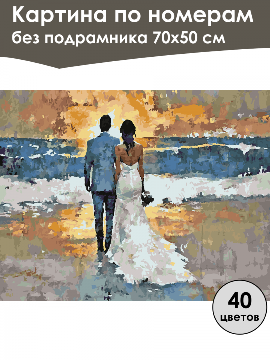 Картина по номерам без подрамника, размер 70х50 см, произведена нами. Она включает 40 оттенков и 2895 контуров, что придаёт ей глубину цвета и плавные переходы. Картина выглядит более ярко и живо. В комплект входит глянцевый лак, которым можно покрыть работу по желанию. Краски имеют хорошую укрывистость, хватает двух проходов что бы закрасить символы на схеме. Так же они сохраняют текстуру мазков, не растекаясь и не разглаживаясь полностью на холсте. При покрытии глянцевым лаком создаётся эффект приближенный к масляной живописи. Краски упакованы герметично, что сохраняет их жидкими. Все необходимые инструменты для начала работы также входят в комплект. Мы не используем экосольвентные чернила, которые содержат свинец и могут быть вредны для здоровья. Наши картины напечатаны безопасными водными пигментными чернилами, обеспечивающими чёткое изображение и легко читаемые обозначения. Холст плотный, имеет мелкую зернистость, легко разглаживается и устойчив к сминанию. Картина поставляется в бурой коробке. Следует отметить, что картина без подрамника её нельзя натянуть на подрамник из-за узких краёв, она предназначена для оформления в рамочку. Стилизованная картина с абстрактными мазками, на которой пара в свадебной одежде — мужчина в костюме и женщина в белом платье — держатся за руки и гуляют по пляжу навстречу заходящему солнцу, создающему эффектное световое отражение на воде.