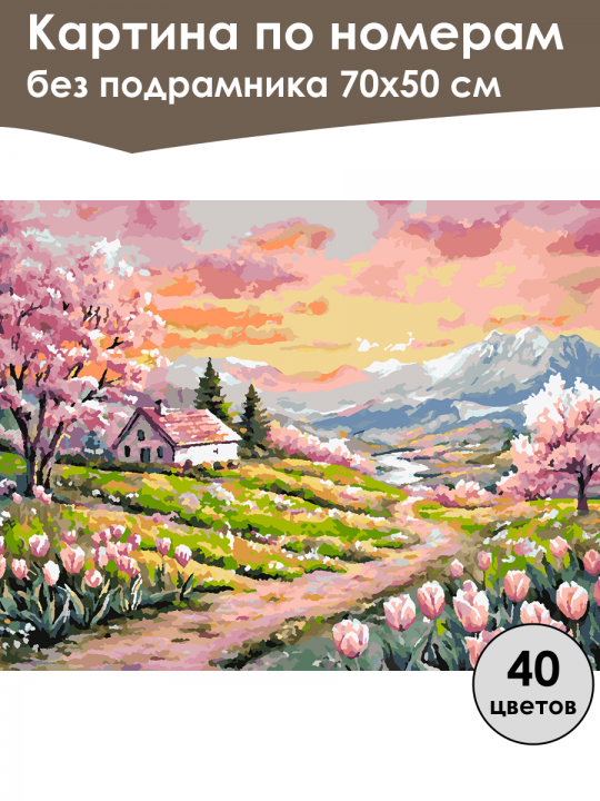 Картина по номерам без подрамника, размер 70х50 см, произведена нами. Она включает 40 оттенков и 3407 контуров, что придаёт ей глубину цвета и плавные переходы. Картина выглядит более ярко и живо. В комплект входит глянцевый лак, которым можно покрыть работу по желанию. Краски имеют хорошую укрывистость, хватает двух проходов что бы закрасить символы на схеме. Так же они сохраняют текстуру мазков, не растекаясь и не разглаживаясь полностью на холсте. При покрытии глянцевым лаком создаётся эффект приближенный к масляной живописи. Краски упакованы герметично, что сохраняет их жидкими. Все необходимые инструменты для начала работы также входят в комплект. Мы не используем экосольвентные чернила, которые содержат свинец и могут быть вредны для здоровья. Наши картины напечатаны безопасными водными пигментными чернилами, обеспечивающими чёткое изображение и легко читаемые обозначения. Холст плотный, имеет мелкую зернистость, легко разглаживается и устойчив к сминанию. Картина поставляется в бурой коробке. Следует отметить, что картина без подрамника её нельзя натянуть на подрамник из-за узких краёв, она предназначена для оформления в рамочку. Живописная про летняя сцена с цветущими розовыми деревьями, которые обрамляют деревенский домик с красной крышей, расположенный среди цветущих полей с тюльпанами, на фоне гор и закатного неба, окрашенного в яркие оттенки розового и оранжевого.